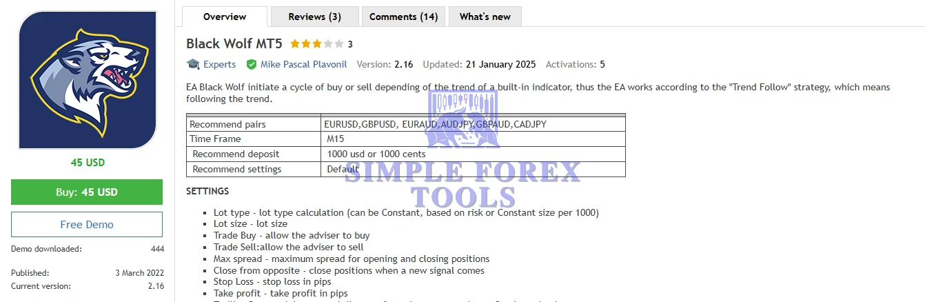 2. What strategy does Black Wolf EA use? It uses a trend-following strategy powered by a built-in trend detection indicator.