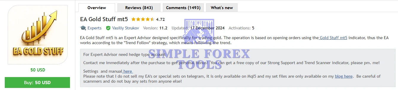 What makes this tool attractive is that it is not marketed as a random plug-in with vague promises. The available details and settings show a more structured system aimed at traders who want automation with room for control. It is sold for MT5, supports hedge-type accounts, and the current official listing shows a 4.72 rating, 843 reviews, price $50, and version 11.2, updated on 17 December 2024.