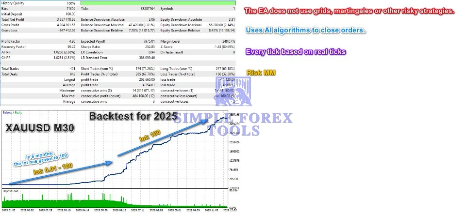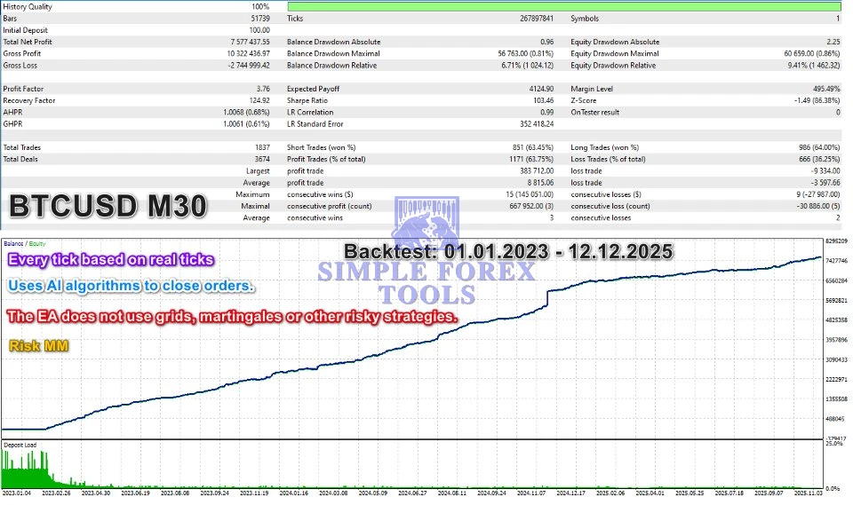 This EA is optimized for high-volatility instruments such as XAUUSD (Gold), BTCUSD, and ETHUSD on the M30 timeframe. -
