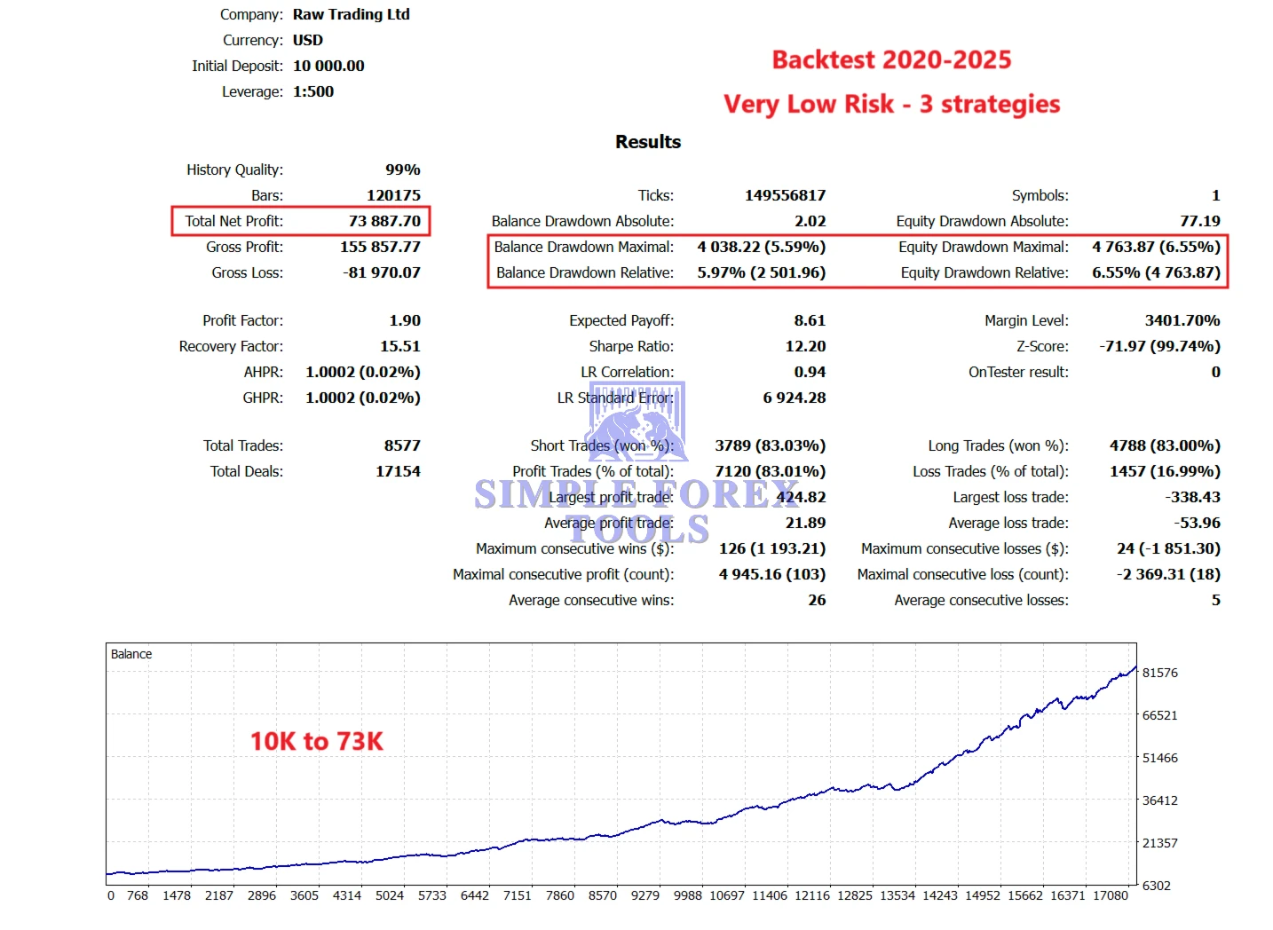 Operates up to three strategies simultaneously on the M15 timeframe for enhanced efficiency. -