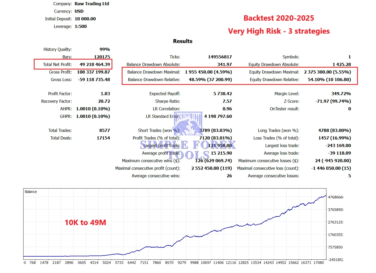 Backtests show an impressive ROI reaching up to 330,000%, highlighting the EA’s optimized trading logic. -