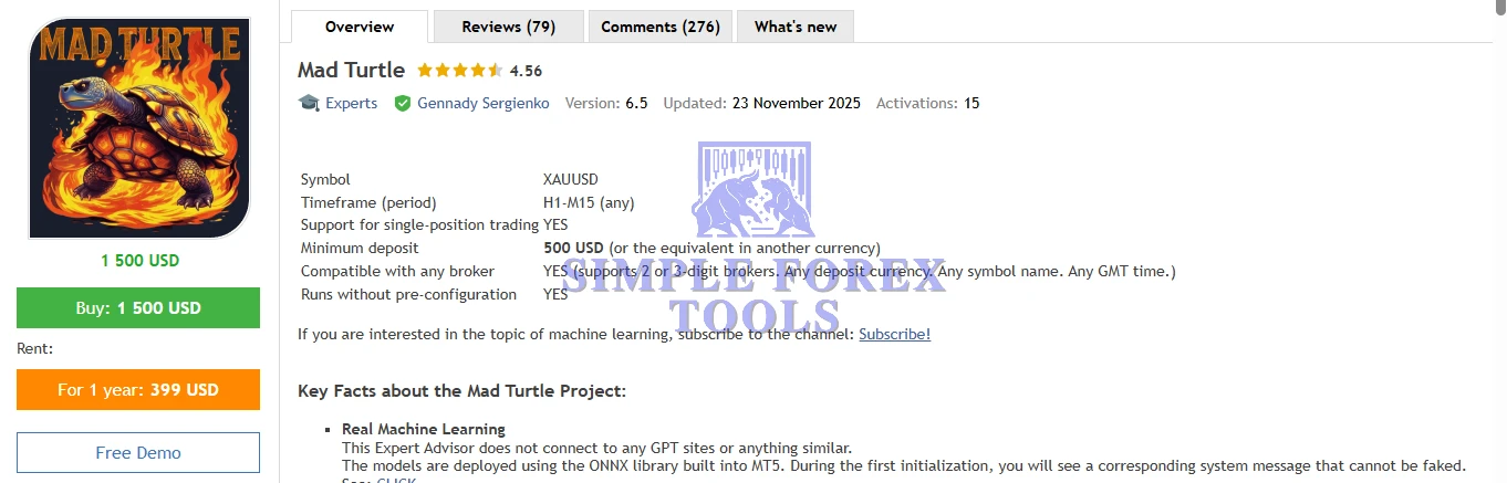 Mad Turtle EA is developed by Gennady Sergienko, a professional MQL5 developer with 8+ years of experience. He is also the creator of other well-known products such as Nesco EA MT4/MT5 and Trader Station MT4.