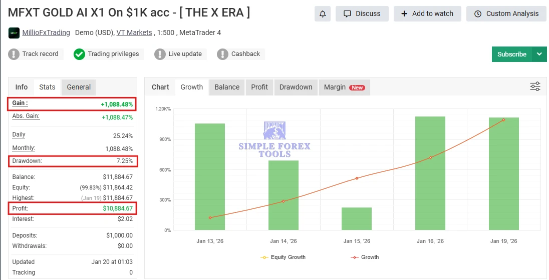 MFXT GOLD AI X1 MT5 – MYFXBook +1088% Gain | Low Drawdown | AI-Powered Gold Trading Expert Advisor