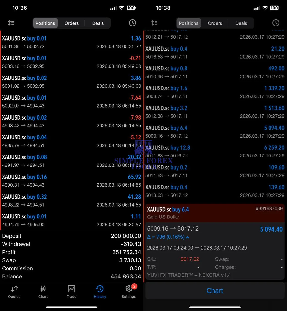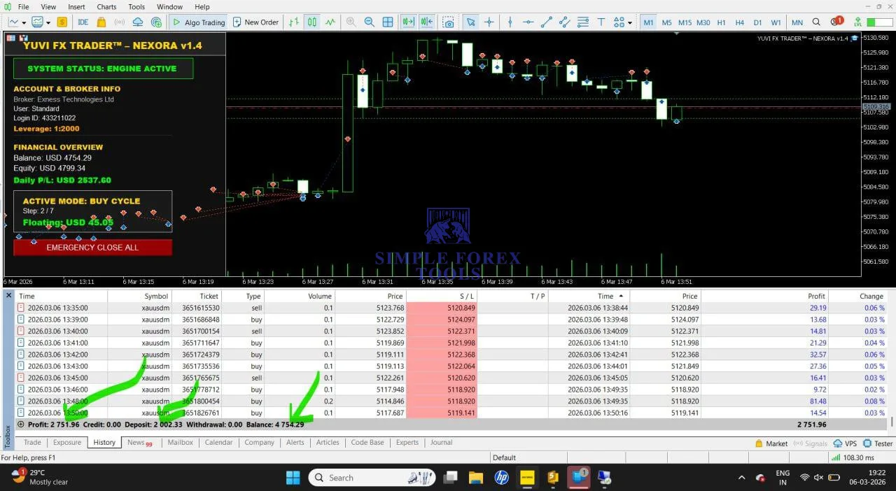 Based on the screenshots and public positioning, Yuvi Nexora EA MT5 appears to follow a fast-response Gold trading model that looks suitable for short-term volatility. Public descriptions emphasize real-time market response, high-speed execution, and structured risk control, while your screenshots show clusters of trades and cycle labels that support that positioning.